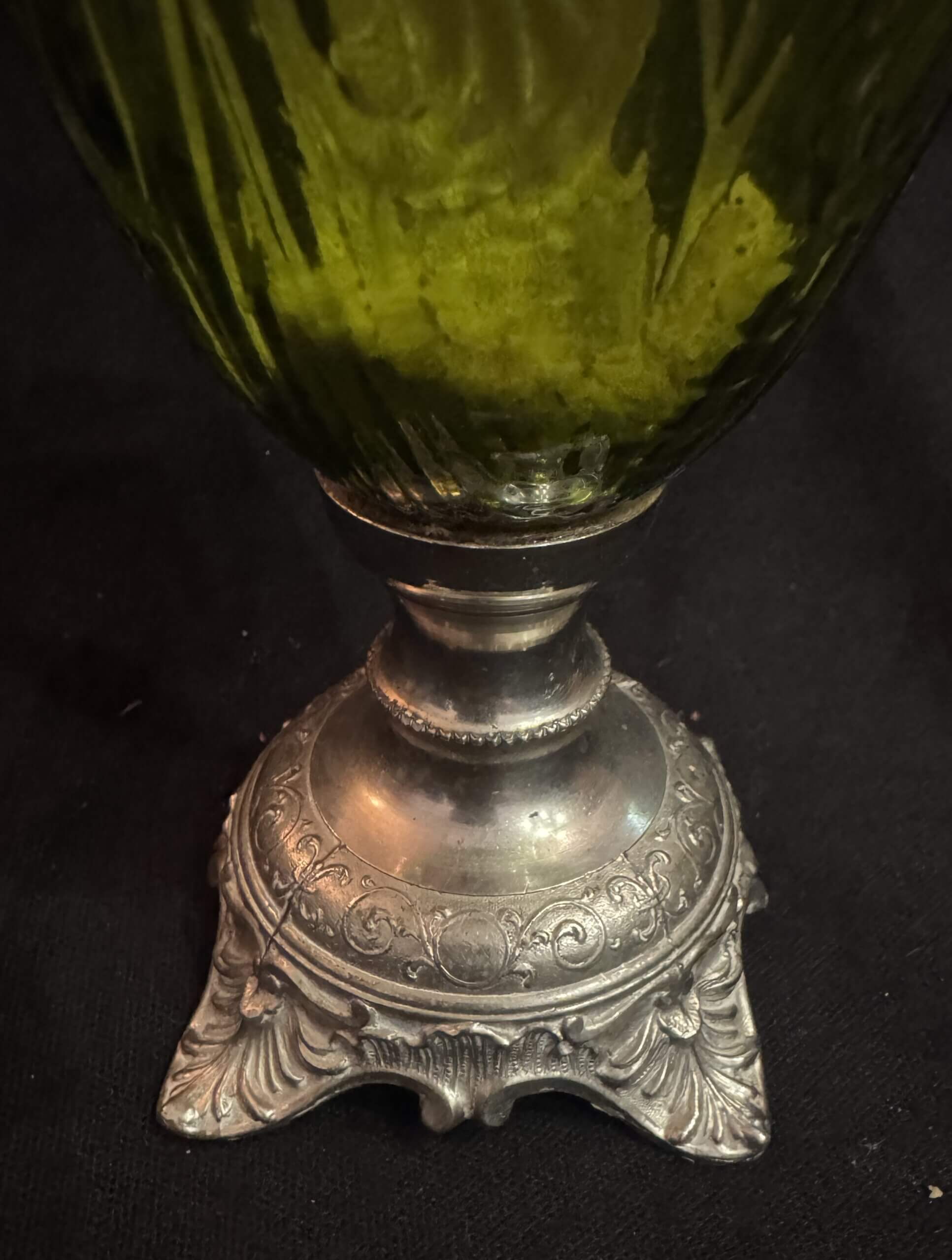 Bien posée sur son pied régule travaillé, elle présente une très jolie toupie oblongue de verre vert. Entièrement restaurée, elle est en état de marche.